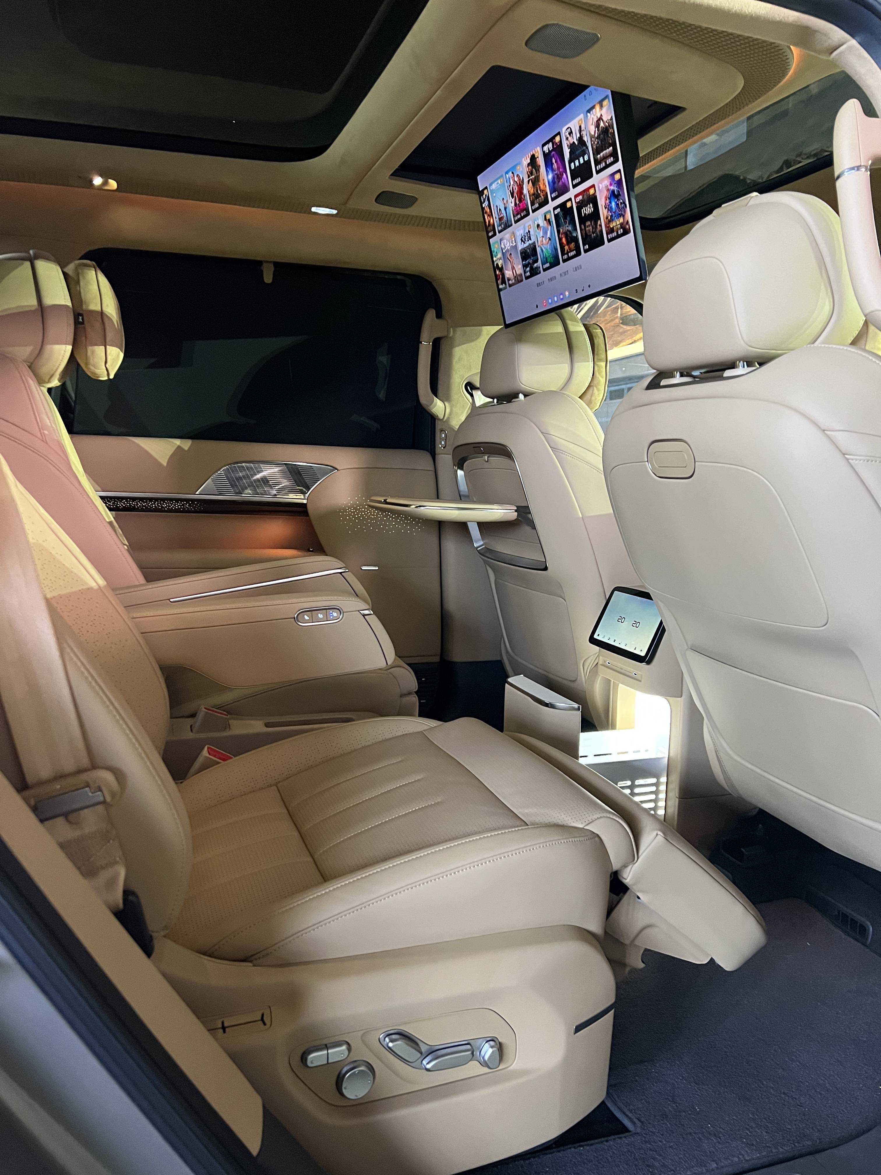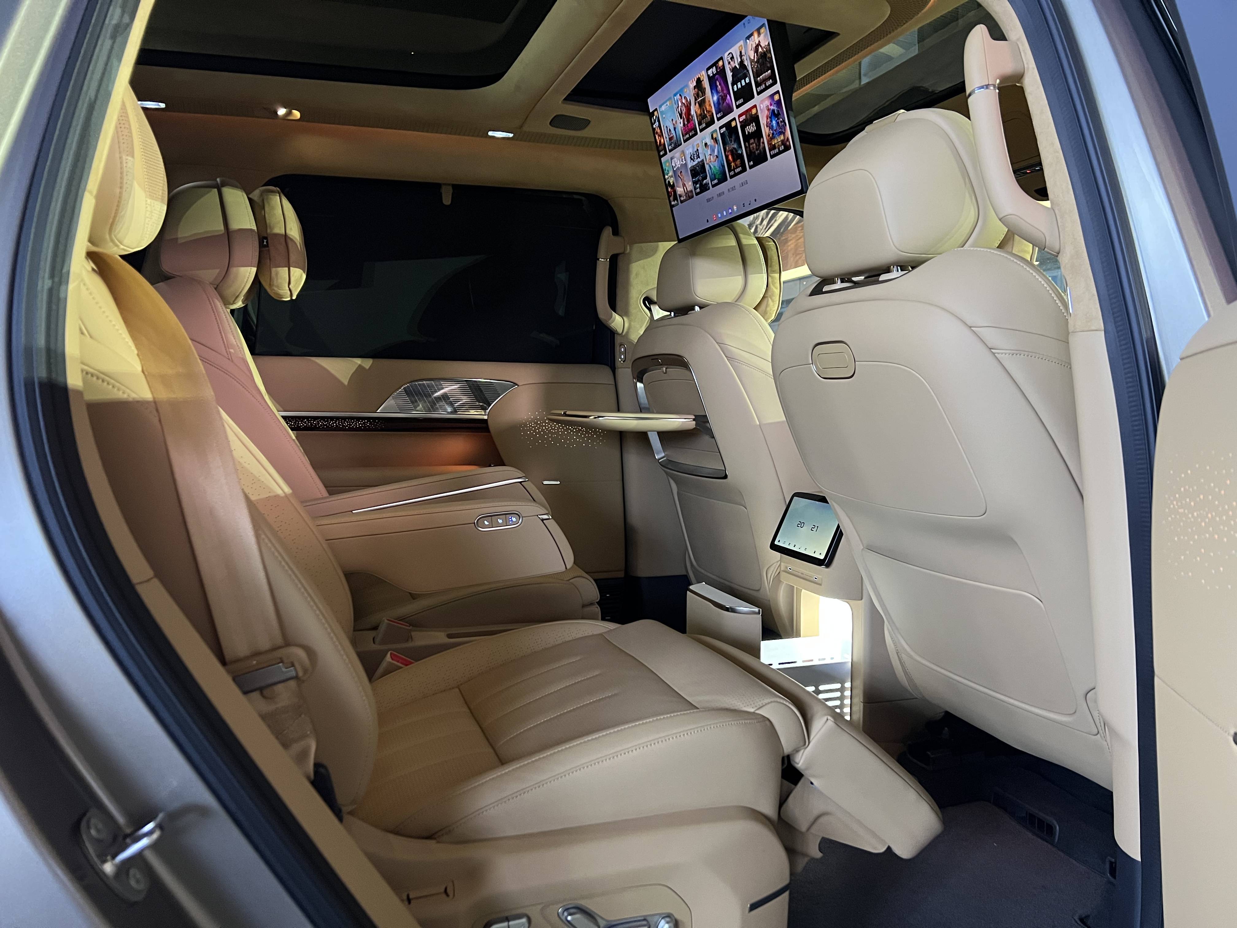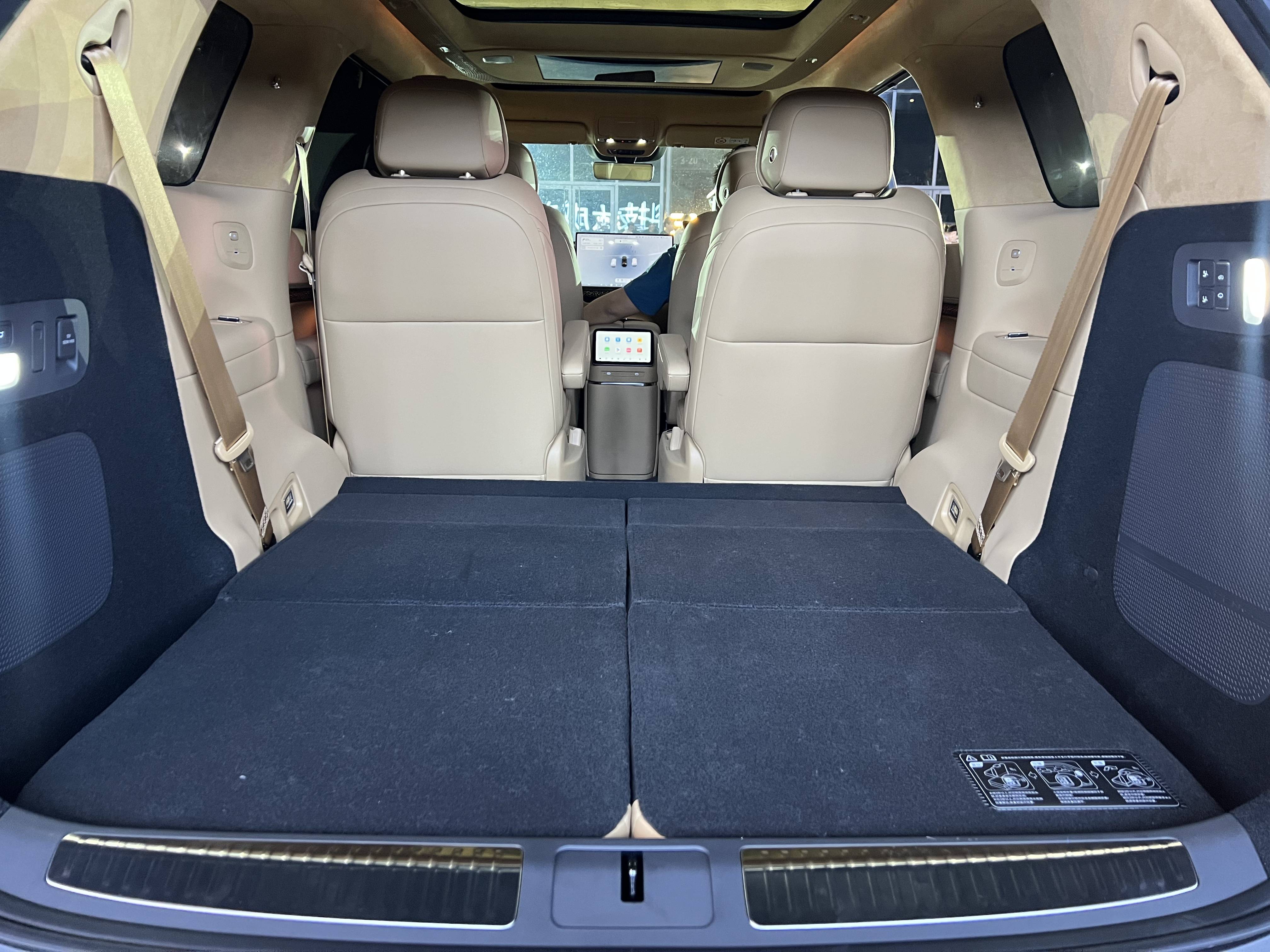 车内采用2+2+2的六座布局,前排座椅支持电动调节/加热/通风/按摩等功能,副驾为带电动腿托的零重力座椅。二排右侧为零重力座椅,左侧为飞航舒享座椅,电调/加热/通风/按摩也全配齐,再配合21.4英寸3K吸顶娱乐屏、智能冷暖冰箱、折叠小桌板、33扬聆境AI音响Max、AI调光隐私玻璃、RNC座舱主动降噪以及静感柔风中央空调2.0等配置,乘坐舒适性不言而喻。而第三排座椅也支持0-180°靠背电动调节以及加热功能,并可电动三折叠纯平放倒,进一步提升实用空间。
