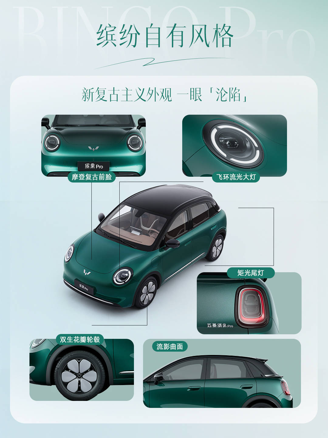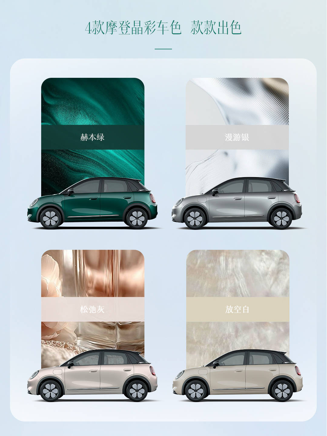 整体造型更加时尚、年轻。前脸部分,新车采用一体式前大灯组,圆形的大灯内部融入三段式圆形的LED日行灯,看上去更加可爱。封闭式格栅搭配两侧导风口及熏黑下格栅则为其增添了一丝运动气息。同时,新车还提供了赫本绿、漫游银、松弛灰、放空白4款配色可选。车身尺寸全面升级至4050×1758×1580mm,轴距达2560mm。