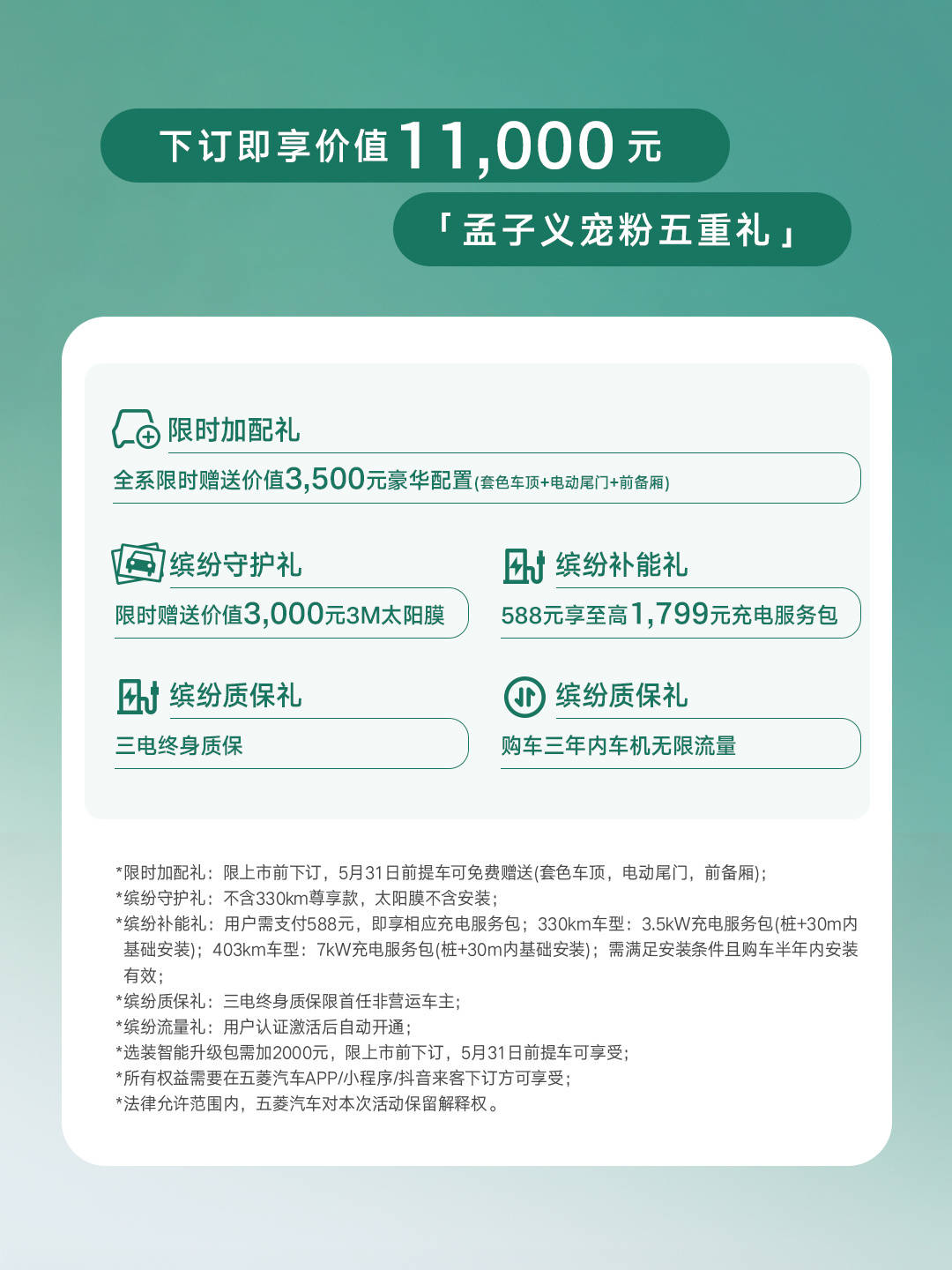 日前,五菱缤果Pro正式开启预售,新车共推出4款车型,预售价5.88万-7.28万元。与此同时,在预售期间,下订即享价值11,000元,“孟子义宠粉五重礼”,以及还可选装智能升级包。