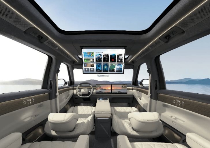至于一些细节方面的设计也非常够巧思。前排15.6英寸中控双联屏、后排21.4英寸吸顶屏、三块SmartSurface魔术屏,加起来九块屏。而魔术屏平时是隐藏在木纹内饰里,需要时才点亮,整洁又有科技感。后排门板上的魔术屏能显示侧后方路况,提醒乘客开门前注意来车,避免开门杀。又比如上下车时,车身会自动降低高度,方便老人和小孩;后备箱开启后也会降低车身,搬重物不用踮脚;停在不平路面时,空气悬架可以一键调平车身。还有车内36处储物空间、婉风空调避免直吹、80度大开角后门配合儿童安全座椅等等,这些加在一起,都体现出新车设计的人文关怀,对家庭用户不得不说是戳到痛点了。