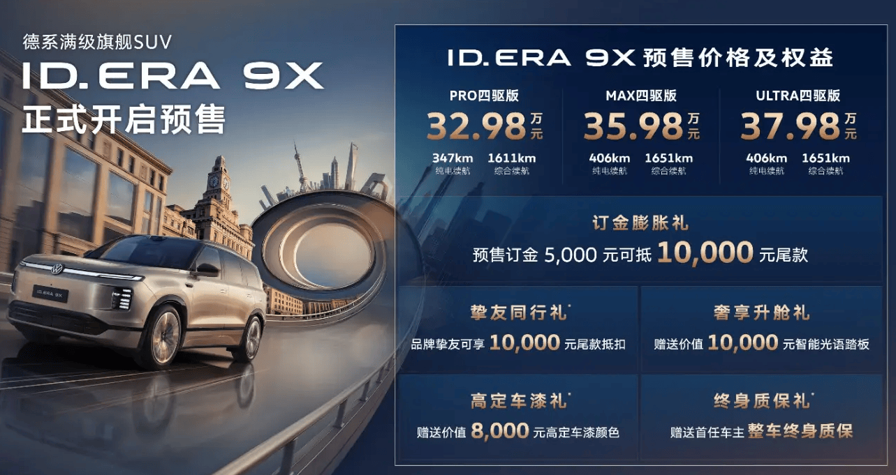 3月30日,上汽大众ID.ERA 9X预售价格正式公布,Pro、Max、Ultra三个版本,全系四驱,预售价分别为32.98万、35.98万和37.98万元。在这个价位区间内,增程SUV的竞争其实已经相当激烈,理想L8、问界M7都是硬茬。但上汽大众不惧挑战,其底气或许就藏在这款车的产品逻辑里。