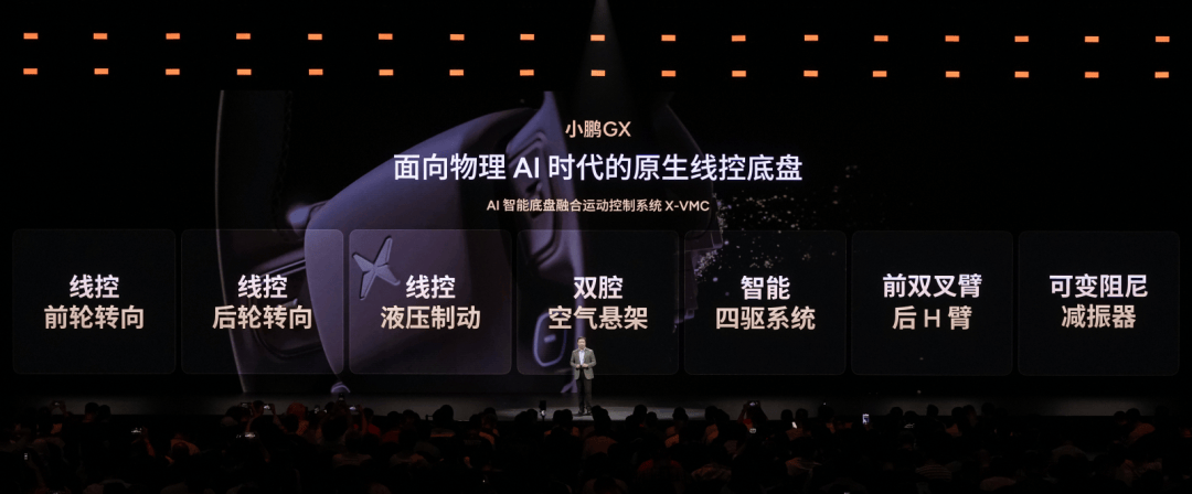 小鹏GX搭载的是原生线控底盘,集成了X-VMC智能融合系统、线控液压制动、线控前轮转向、双腔液压制动、智能四驱系统和线控后轮转向,是大型SUV中少见的“满配”方案。