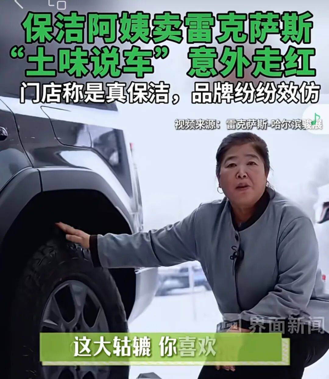 近日,哈尔滨一家雷克萨斯经销店让店内一位58岁的保洁阿姨出镜介绍车型,没想到播放量最高达500多万,而店内账号平常拍摄的浏览量一般几千到几万不等。