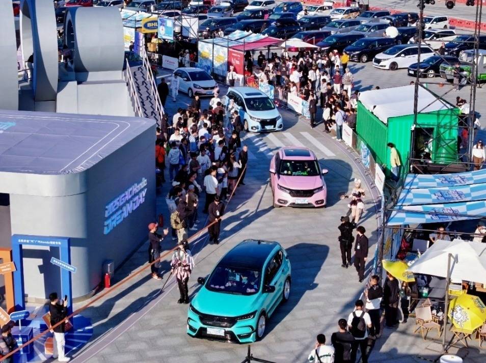 潮玩无界,是这场盛会的另一重底色。现场随处可见“个性表达”:二次元痛车贴着动漫角色贴纸,缓缓驶过主舞台;低趴车聚会中,车主们比拼车身高度与细节改装,引得路人拍照打卡;Cosplay爱好者穿着动漫服饰穿梭在市集,与爱车合影,瞬间拉满次元氛围。翘翘公园限定潮玩市集更是“一站式解忧”,美食摊飘着烤肉香,文创店摆着汽车主题徽章,家长带着孩子玩手工,年轻人围着AI互动装置——AI盲盒机吐出定制贴纸,“躁梦合拍”生成专属海报,每个人都能找到属于自己的乐趣。