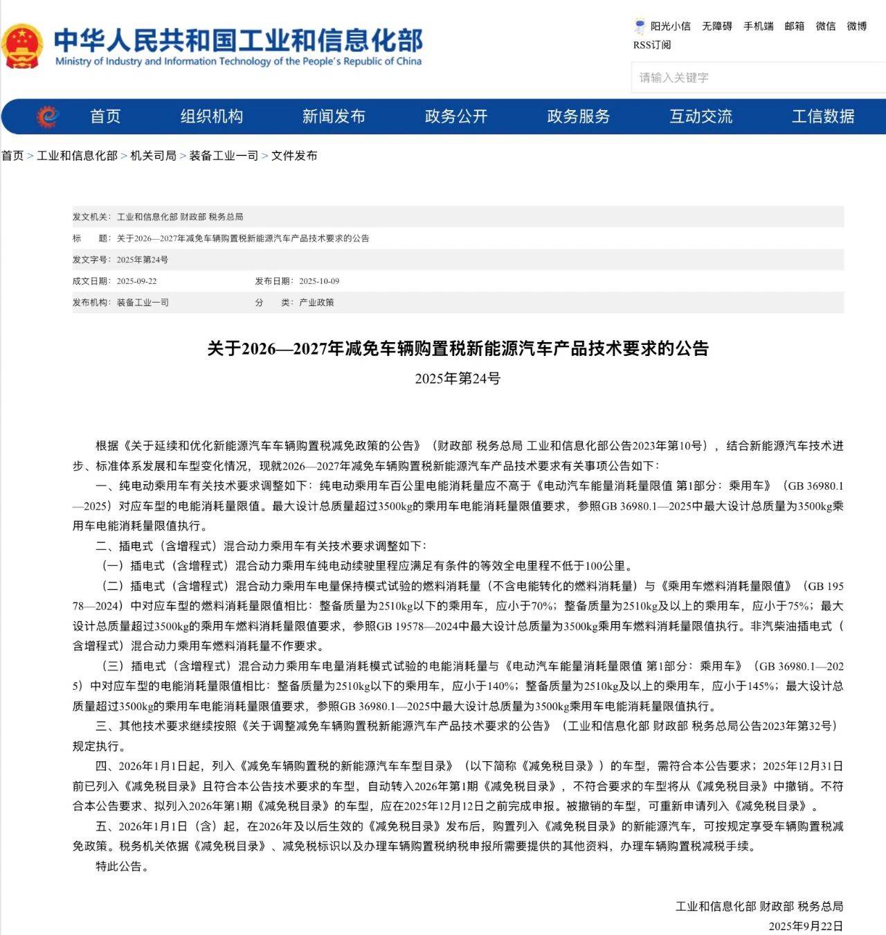 10月9日,工业和信息化部、财政部、税务总局联合发布《关于2026—2027年减免车辆购置税新能源汽车产品技术要求的公告》。车购税是影响新能源汽车消费的重要税种,这一调整势必会对新能源汽车的发展带来一定影响。