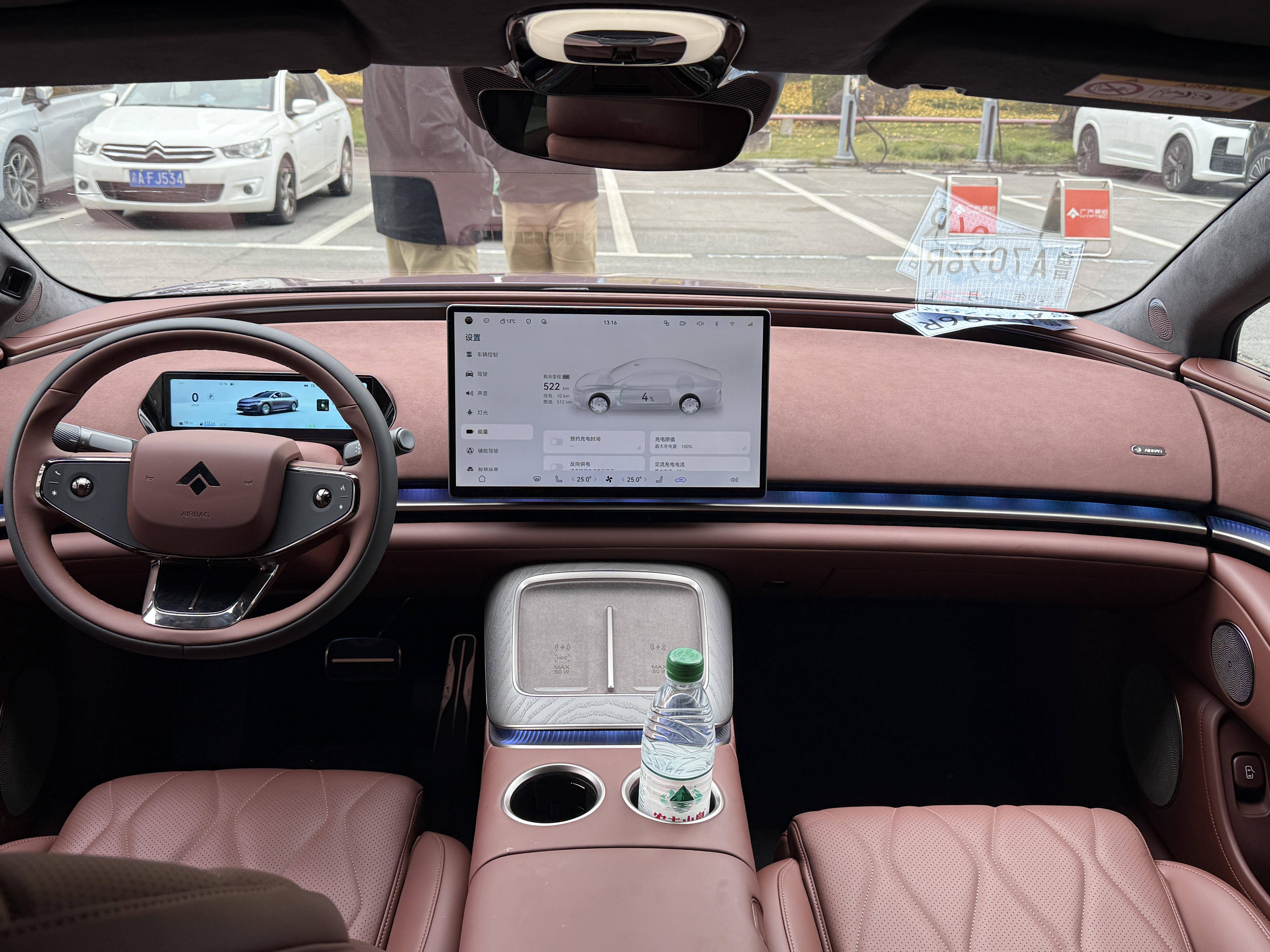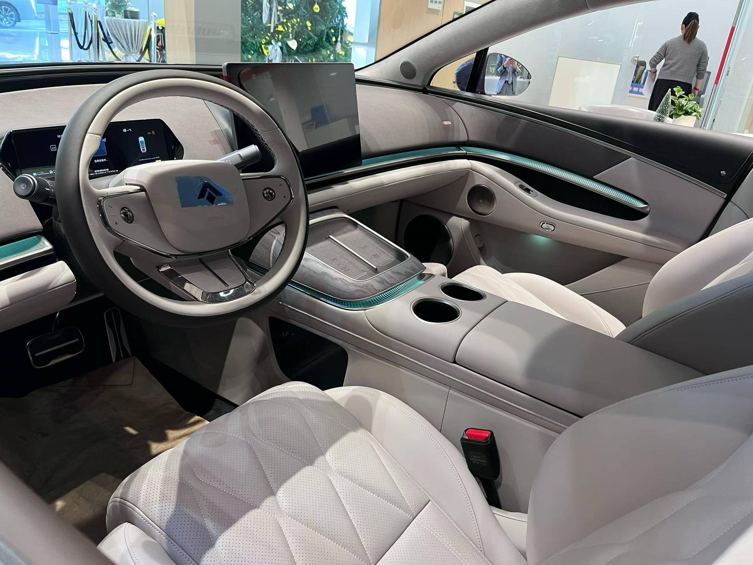 内饰延续了家族化的环抱式座舱,14.6英寸悬浮式大屏配合10.25英寸液晶仪表以及27英寸W-HU抬头显示,营造出科技氛围,并搭载鸿蒙座舱HarmonySpace 5。而大量皮质/麂皮包覆,配合木纹饰板点缀,以及环绕式氛围灯,继续强调豪华感,此外诸如滚轮式多功能方向盘+电子怀挡、双50W手机无线快充加持,也进一步提升了档次感。另外中央扶手箱内还将提供智能冷暖冰箱。